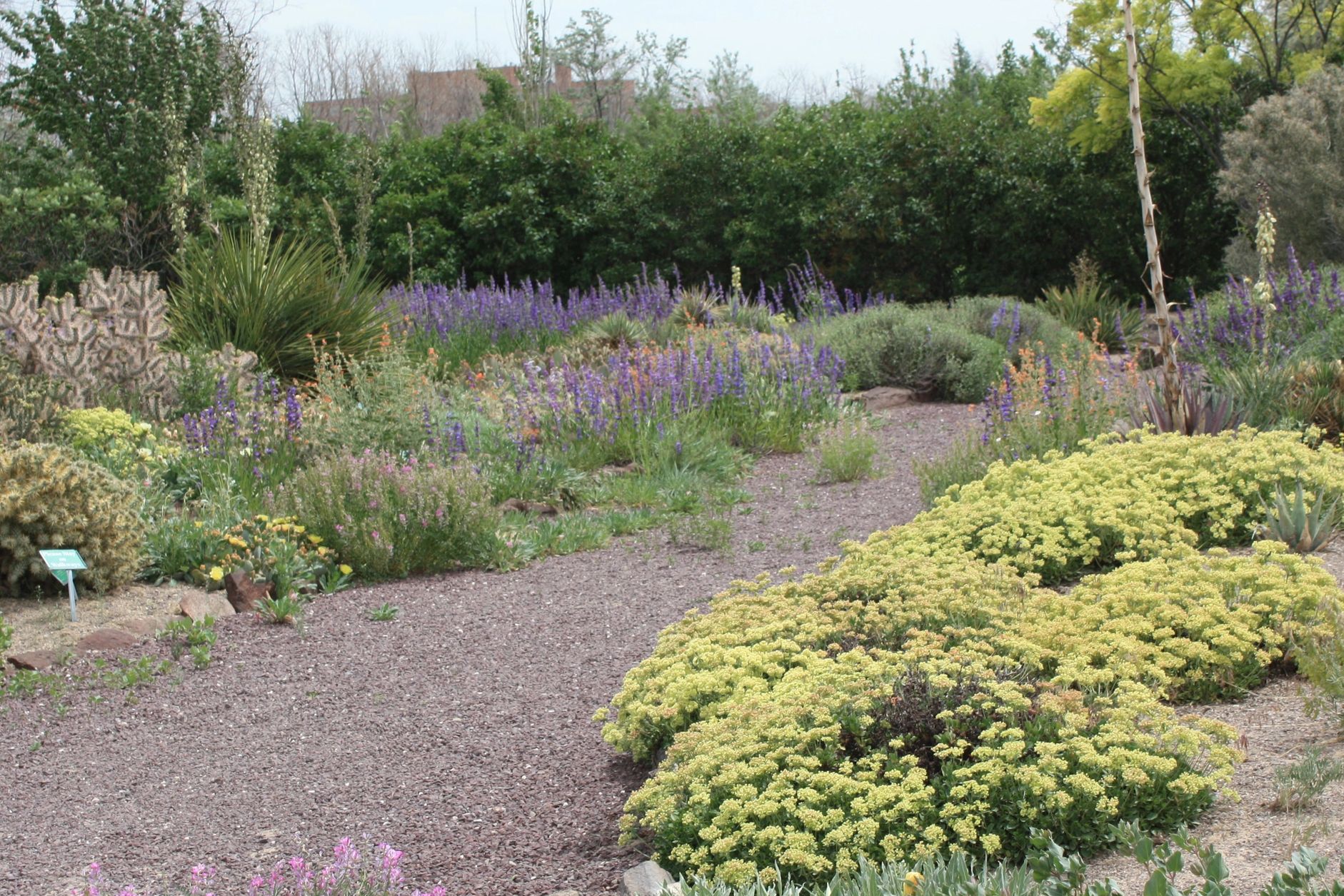 Our garden has all gravel parking and walkways. About 50 yards into the garden we have benches, and a gazebo to view the garden from. We have seating in the farthest pathway as well. Non-motorized wheelchairs seem to struggle in the gravel.